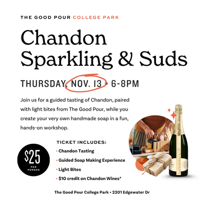 Pop, pour, and get crafty at our Chandon Sparkling & Suds event! Enjoy a guided tasting of Chandon Brut, Rosé, and Spritz, paired with light bites from The Good Pour, while you create your very own handmade soap in a fun, hands-on workshop. Sip bubbles, mix scents, and leave with something beautiful you made yourself.